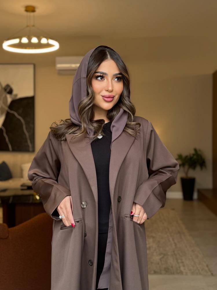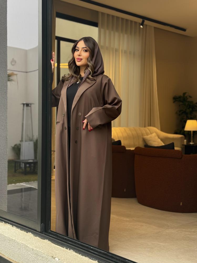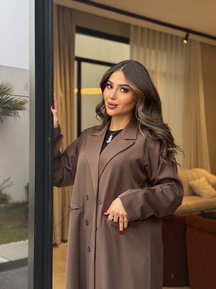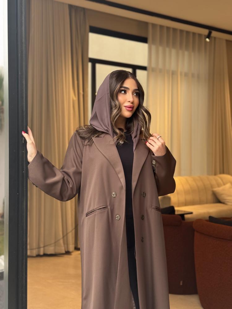 وصف العباية : عباية أنيقة بتصميم عصري: بليزر رسمي تتميز هذه العباية بقصتها ربع كلوش -ستريت خياط مخفي بقماش كريب الابداع مبطن باللون البني ،