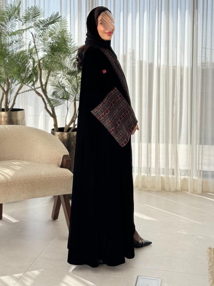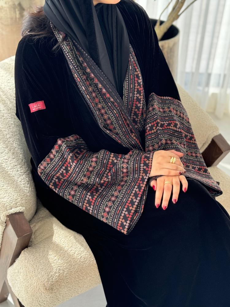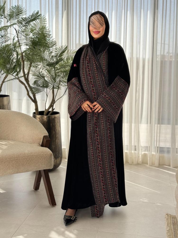 وصف المنتج : عباية شتوية فاخره مصنوعه من قماش المخمل تتدفق بشكل جميل حول جسمك وعليها تدخيلات قماش كشميري رائع وجذاب