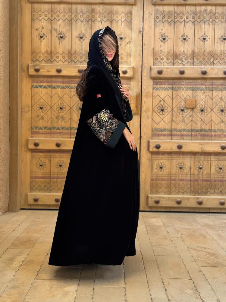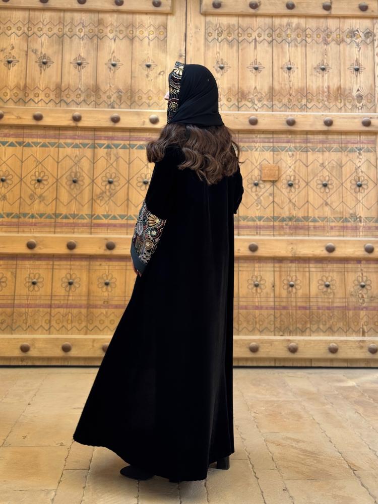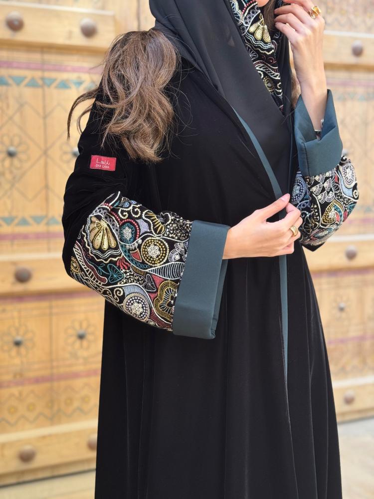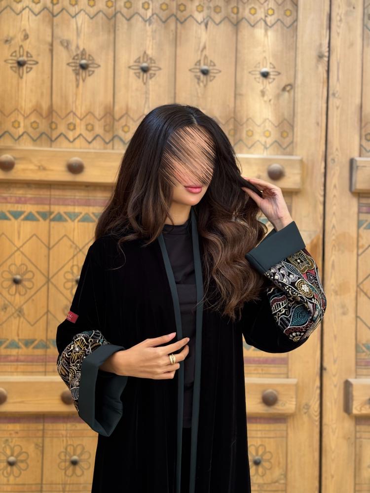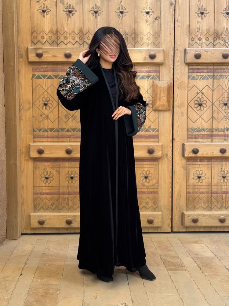 وصف المنتج : عباية مصنوعة من قماش المخمل الكامل باكمام مطرزه بالوان متعددة