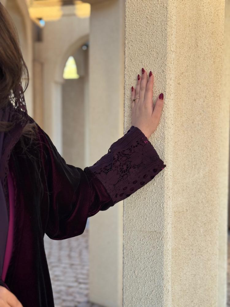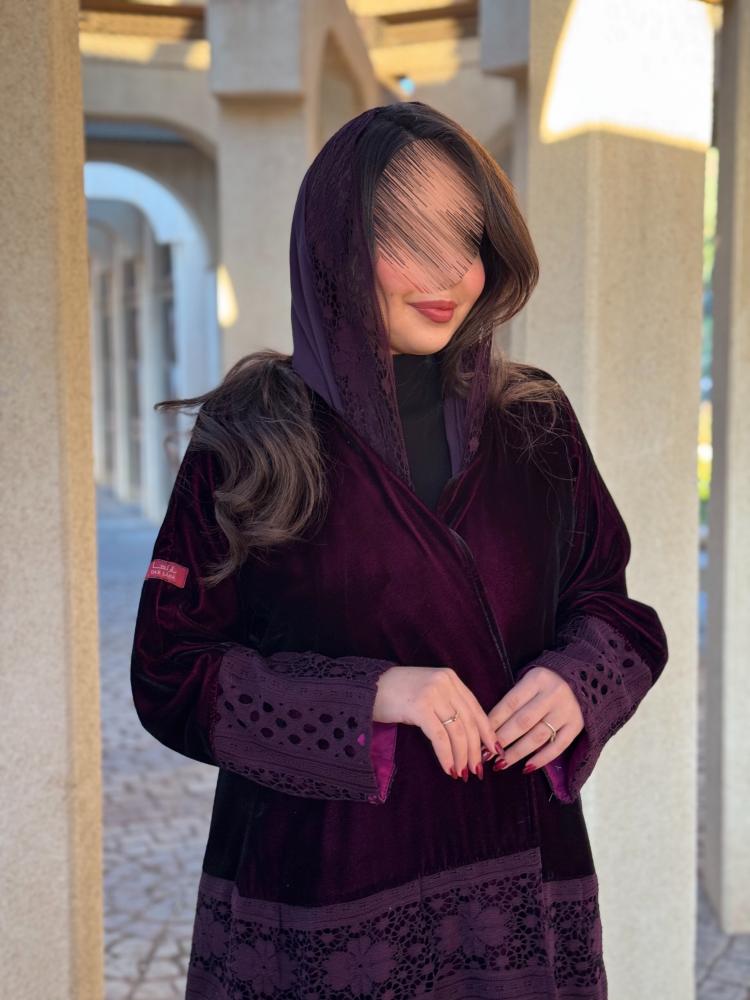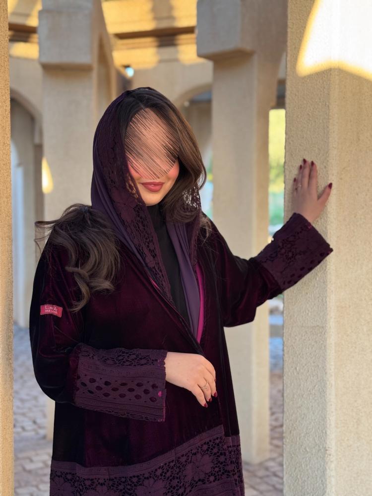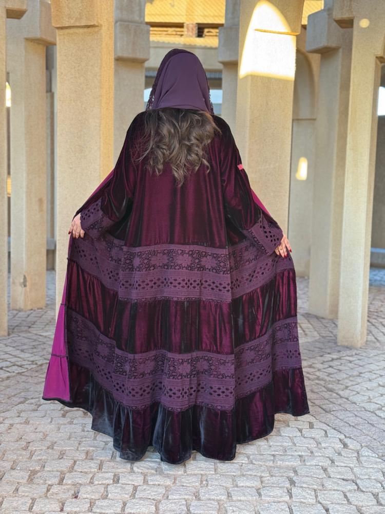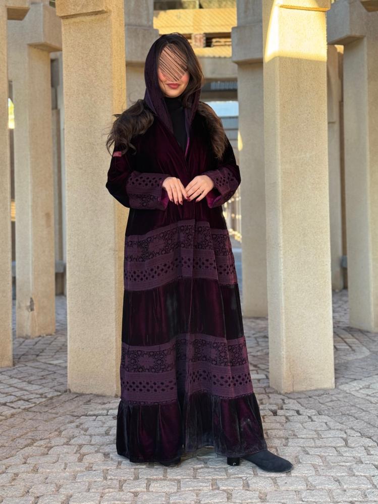 وصف المنتج :عباية شتوية فاخره مصنوعه من قماش المخمل الناعم بتدخيلات من قماش الدانتيل بالوان متناسقة بين القماشين بقصتها الواسعة دبل كلوش على شكل طبقات من اسفل العباية والذي يظهر جمالا فائقا عند اللبس لهذا الكولكشن