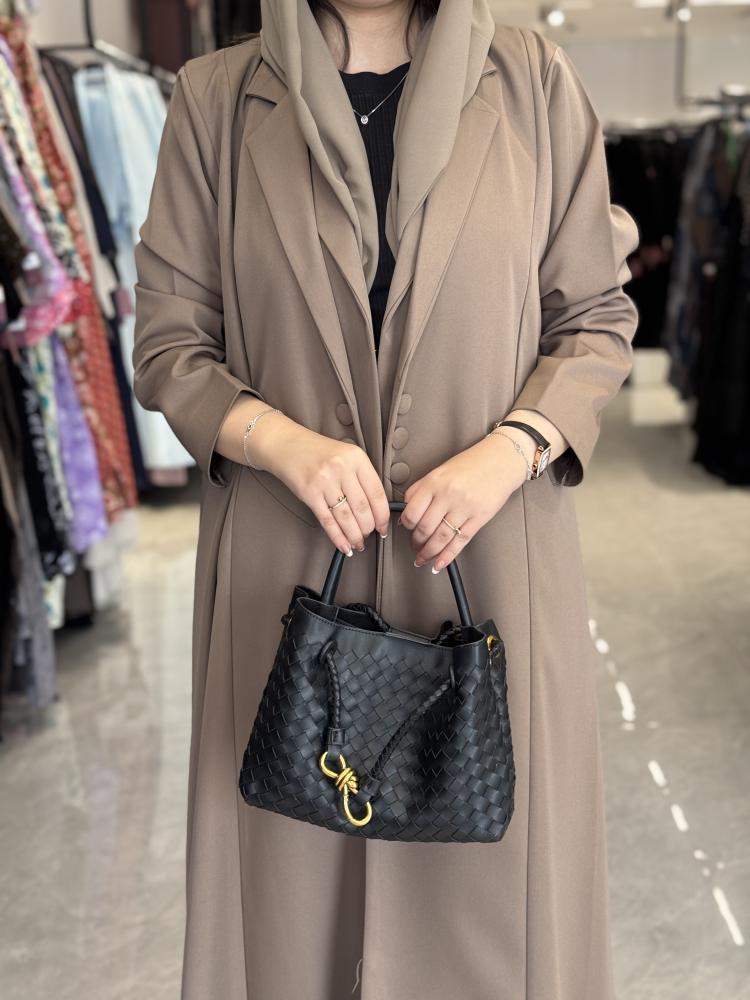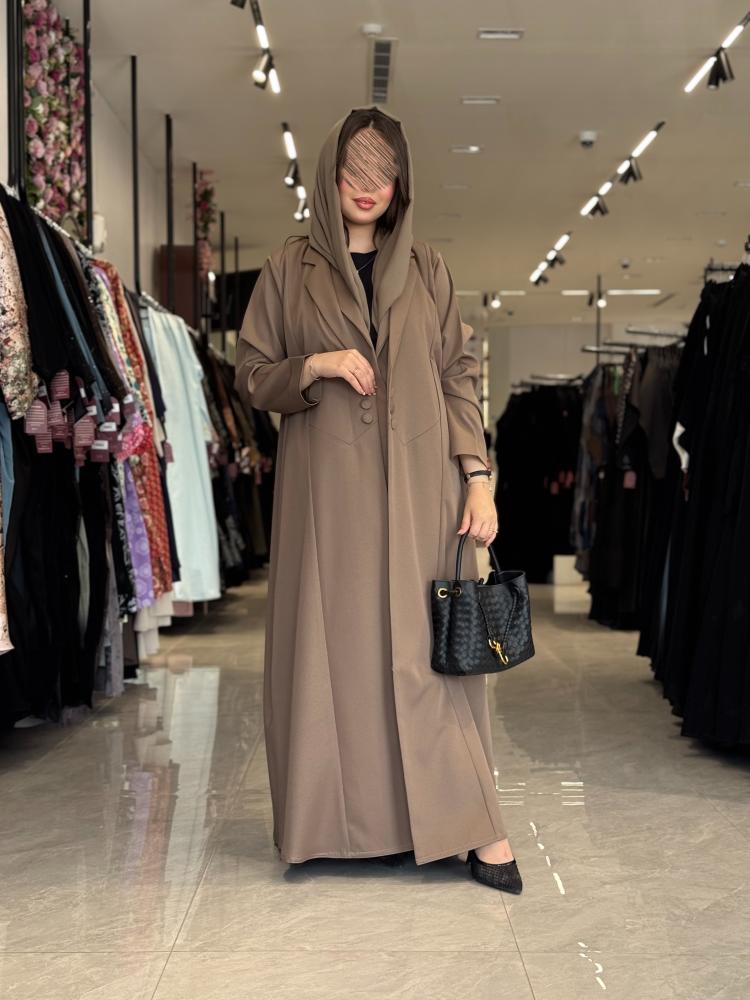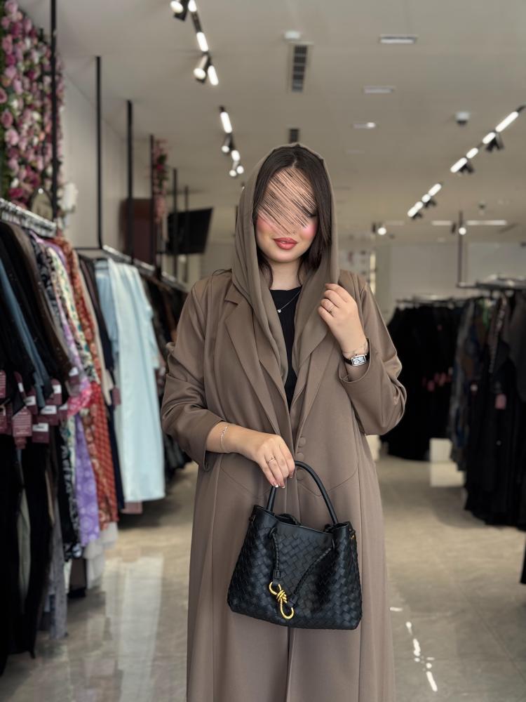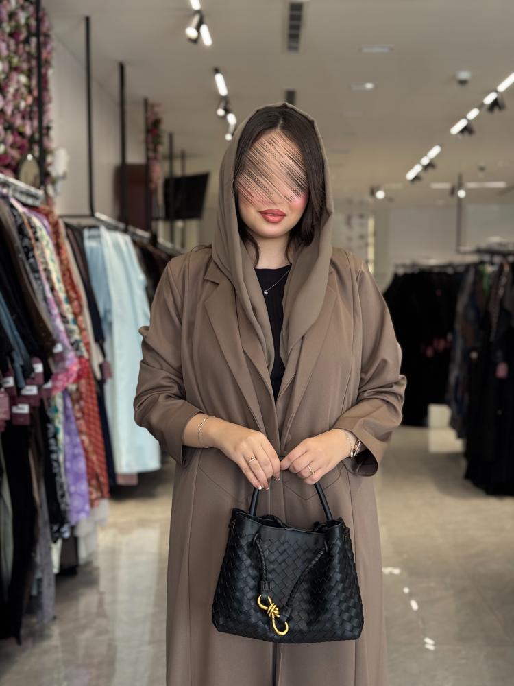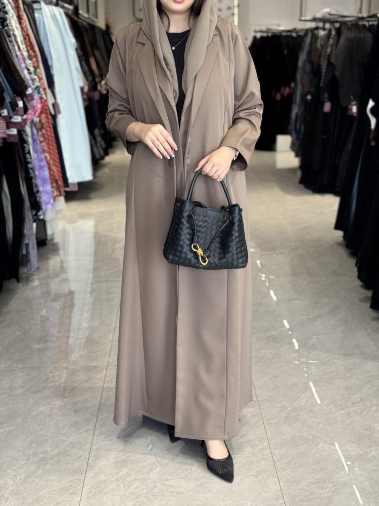 • العباية: بتصميم مفتوح كلاسيكي يعكس الأناقة البسيطة، مزودة بأكمام ناعمة بقصة مريحة.