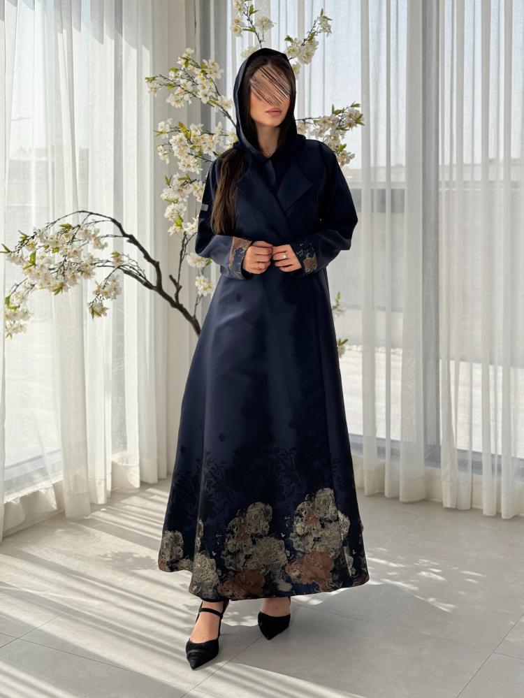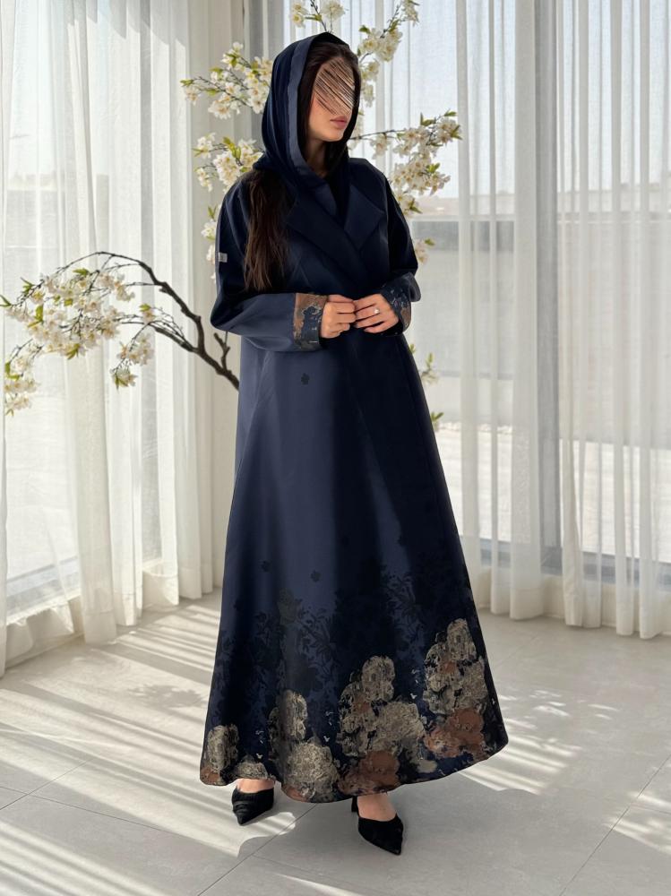 عباية تفتة تدخيلات طبعة ملونه كحلي