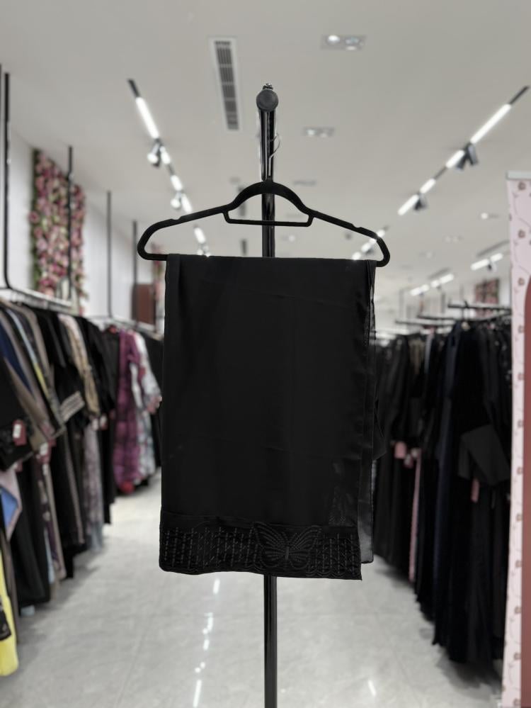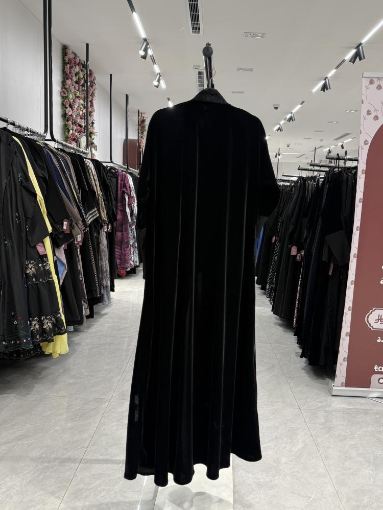 عباية مخمل فاخرة بقصة نصف كلوش، مزينة من الأمام بكلفة مطرزة تضيف لمسة أنيقة راقية.