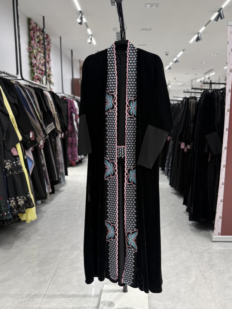 عباية مخمل فاخرة بقصة نصف كلوش، مزينة من الأمام بكلفة مطرزة تضيف لمسة أنيقة راقية.