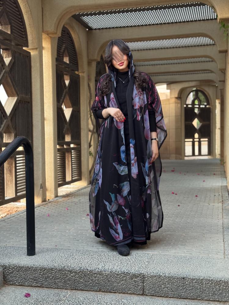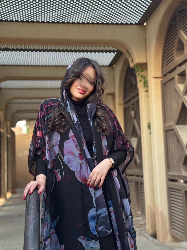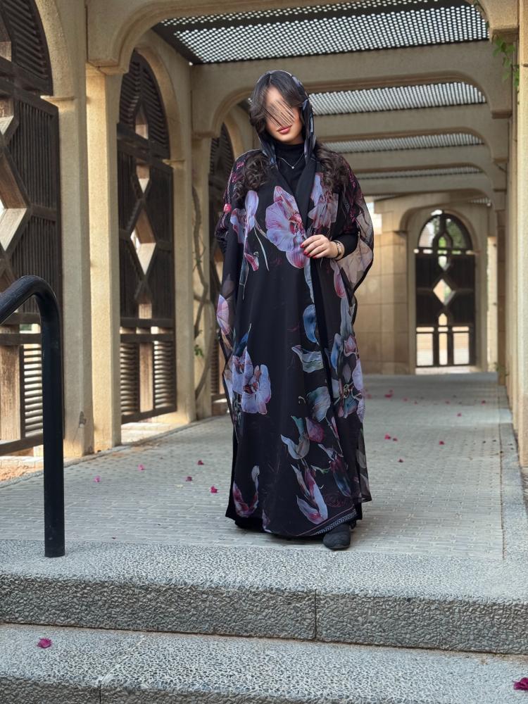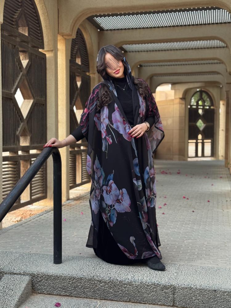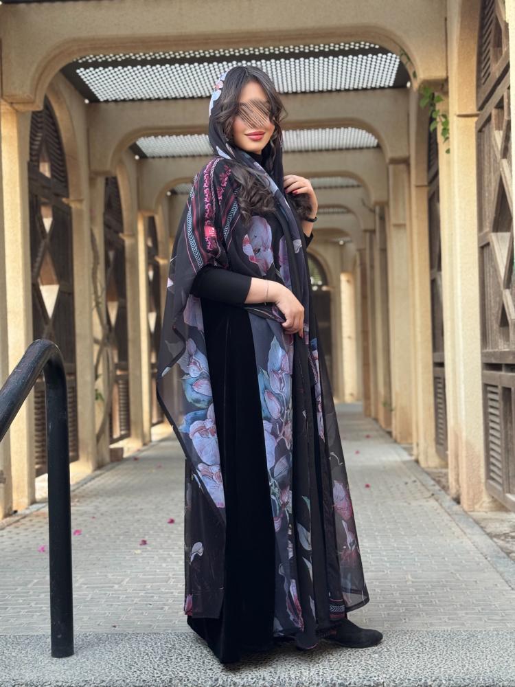 عباية بتصميم نصف بشت أنيق يجمع بين الفخامة والنعومة، مصممة من قماش مخمل ناعم يمنح ملمسًا فخمًا وثباتًا مميزًا في القَصّة. تأتي العباية بطبقة خارجية من قماش الشيفون الخفيف المزين بطبعات ناعمة فاخرة تضيف لمسة أنثوية وانسيابية جذابة عند الحركة.