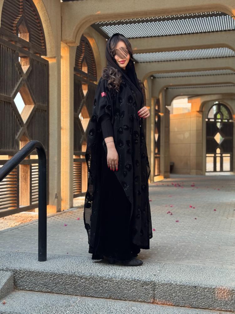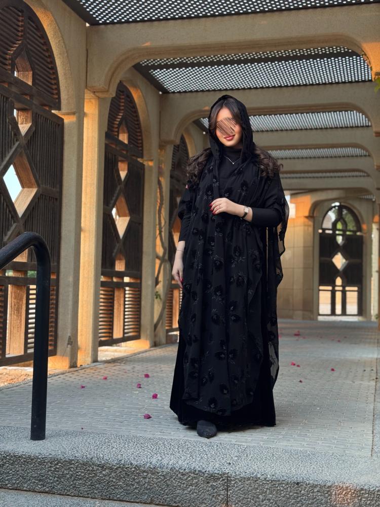 عباية بتصميم نصف بشت أنيق يجمع بين الفخامة والنعومة، مصممة من قماش مخمل ناعم يمنح ملمسًا فخمًا وثباتًا مميزًا في القَصّة. تأتي العباية بطبقة خارجية من قماش الشيفون الخفيف المزين بطبعات ناعمة فاخرة تضيف لمسة أنثوية وانسيابية جذابة عند الحركة.