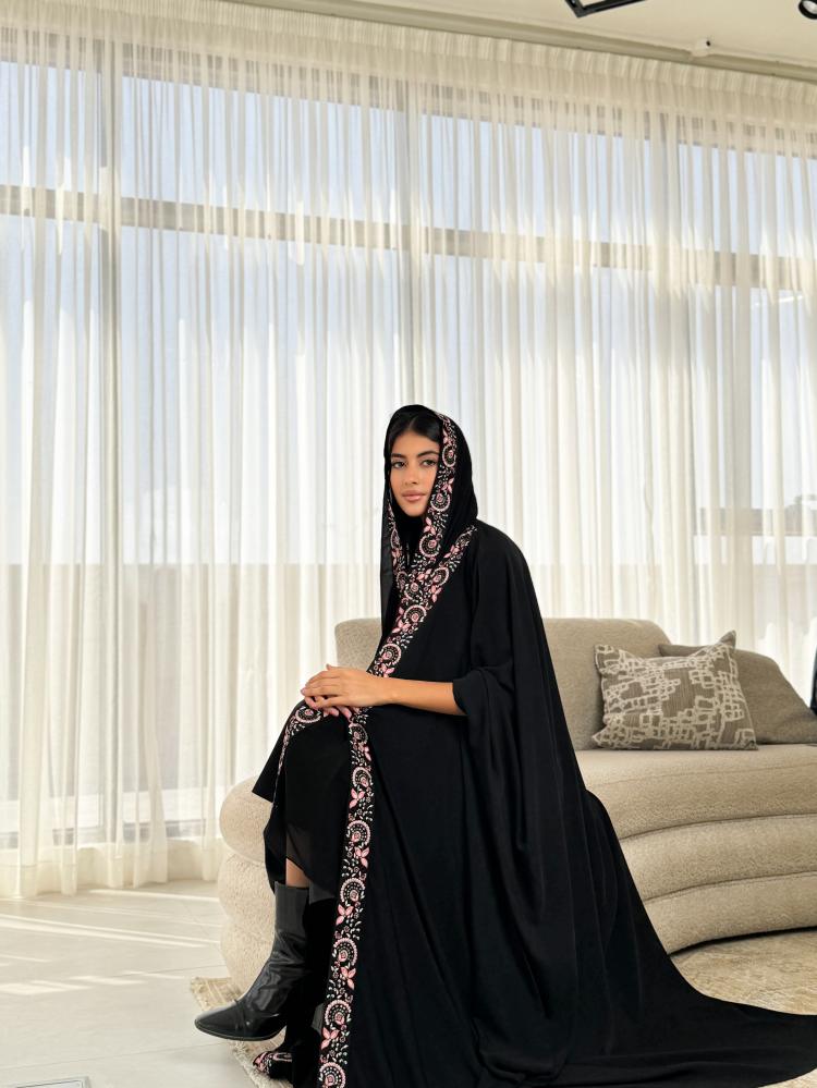 * لون العباية / اسود مع كلفة مطرزة زهري