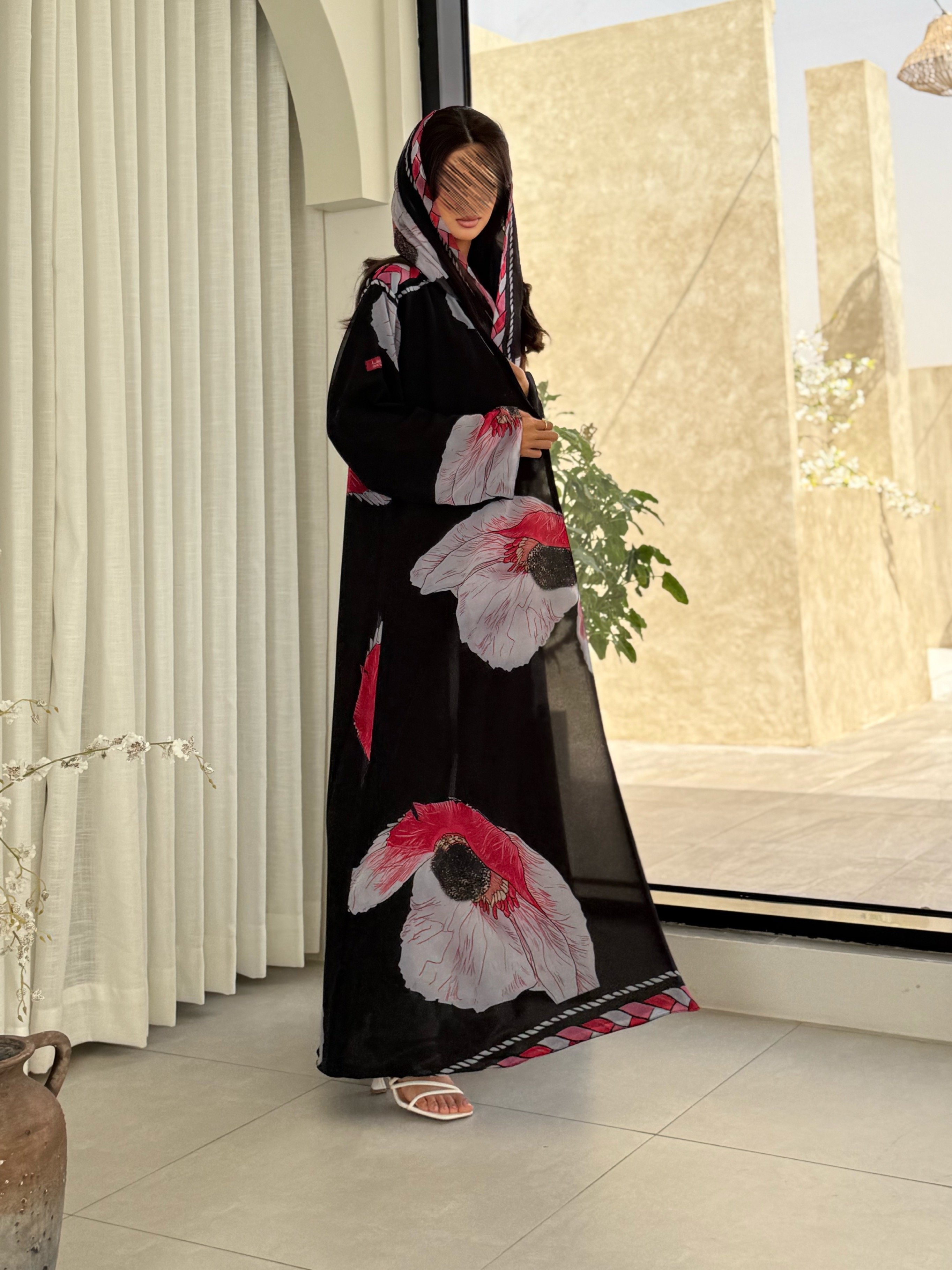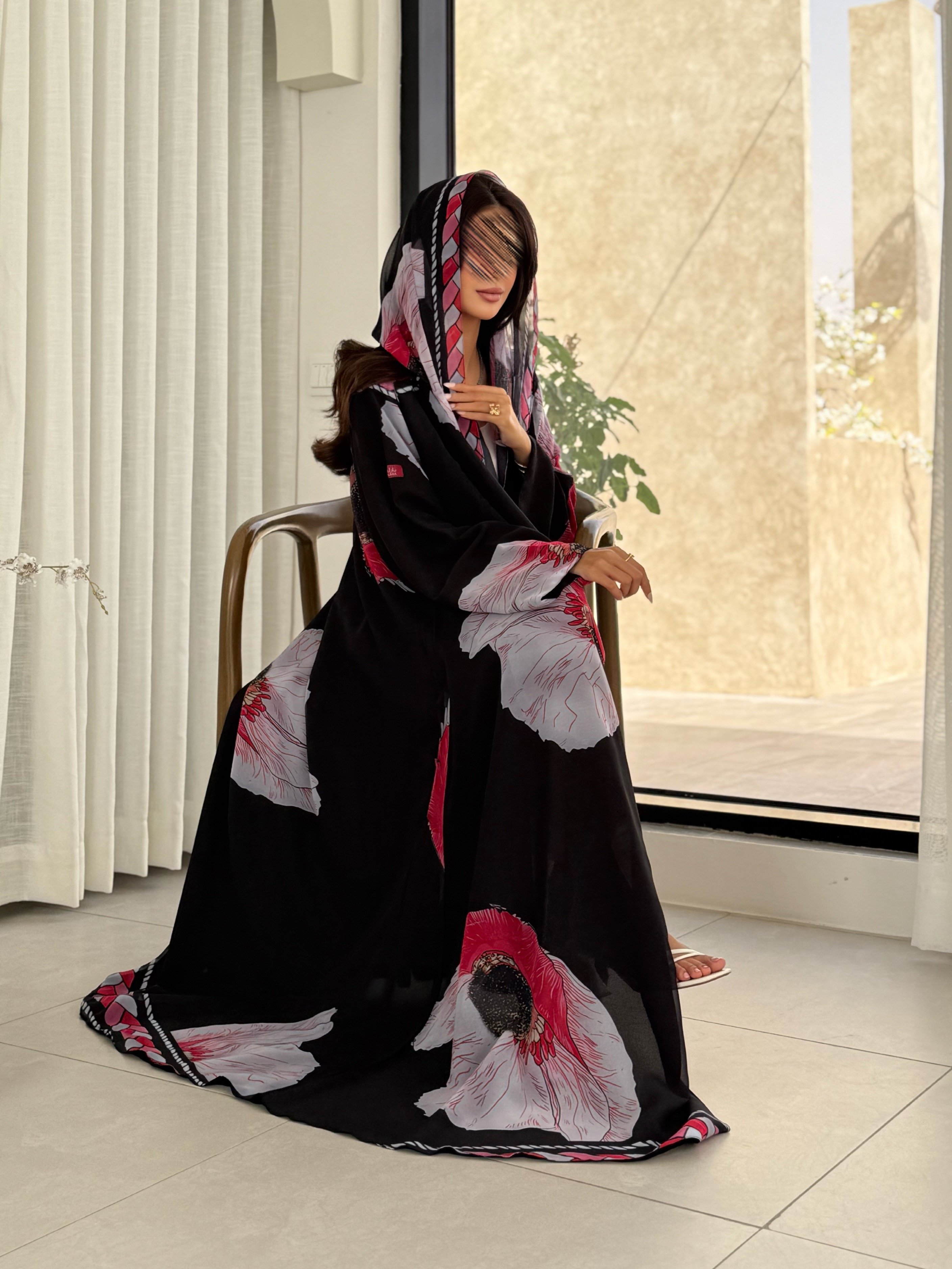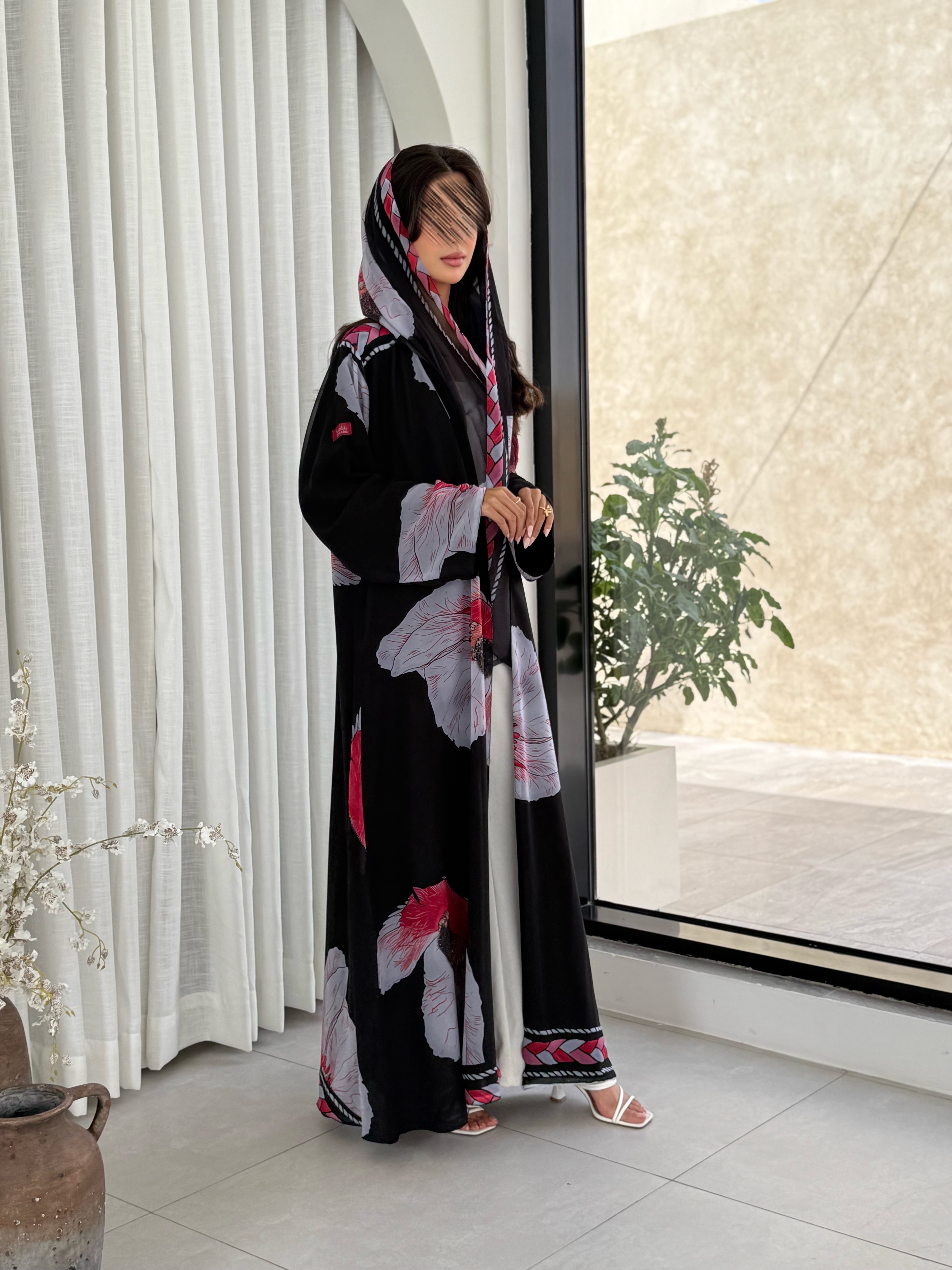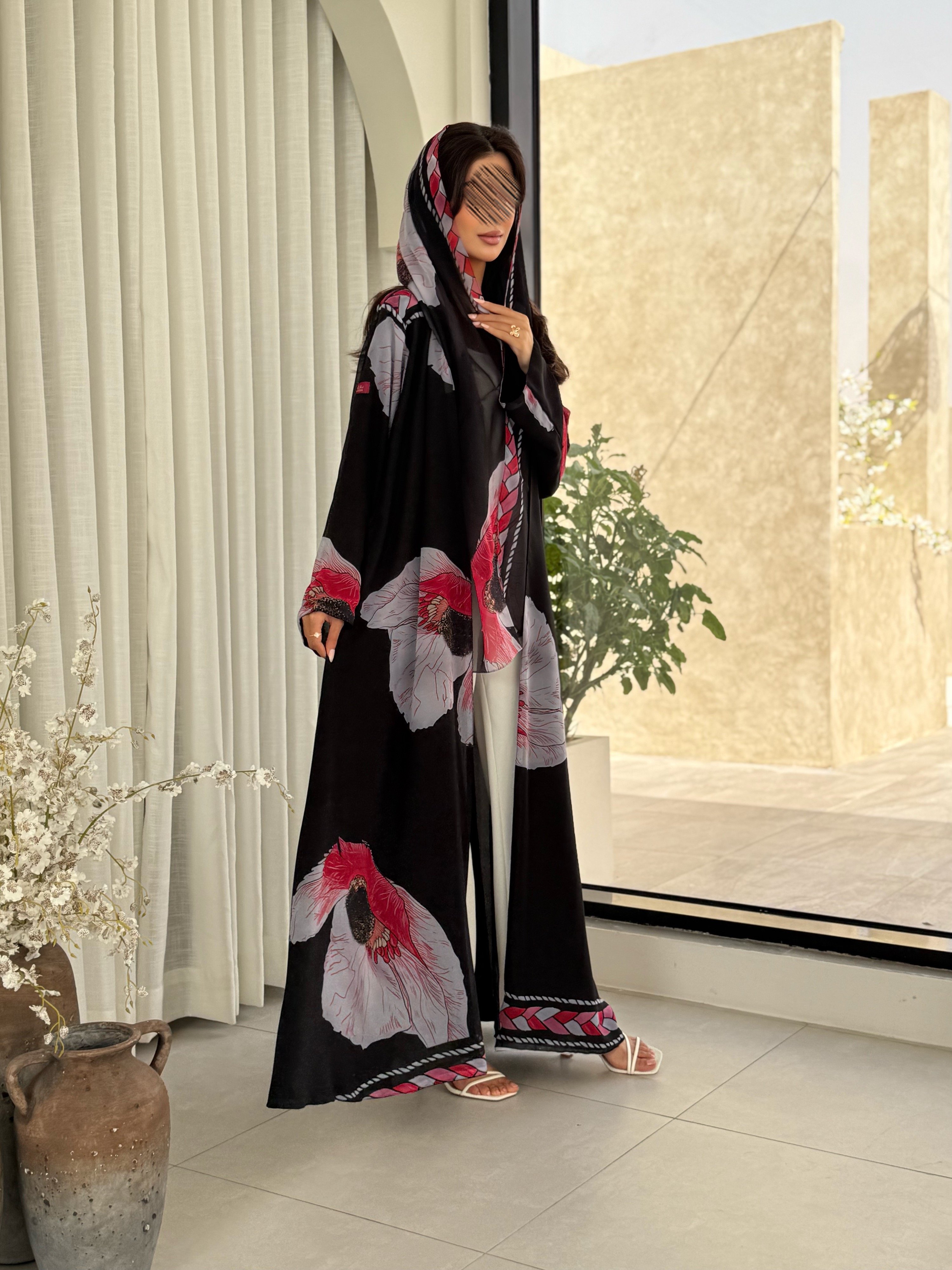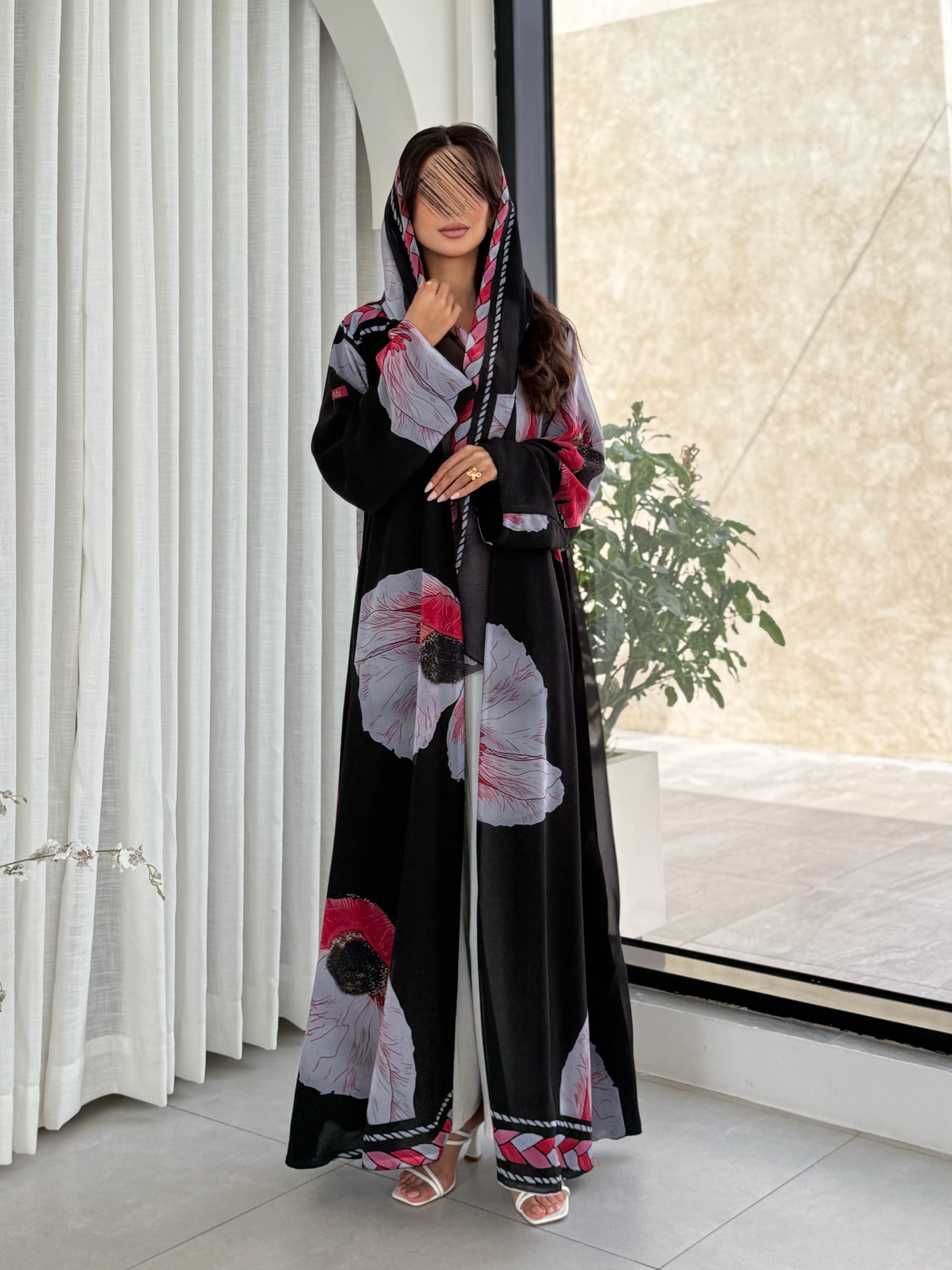 عباية صيفية أنيقة مصنوعة من قماش الشيفون الخفيف المعروف بانسيابيته وملمسه الناعم، مزينة بطبعات ورد ناعمة تضفي لمسة رومانسية أنثوية على التصميم.