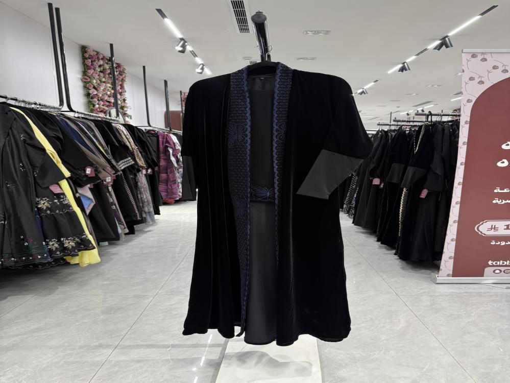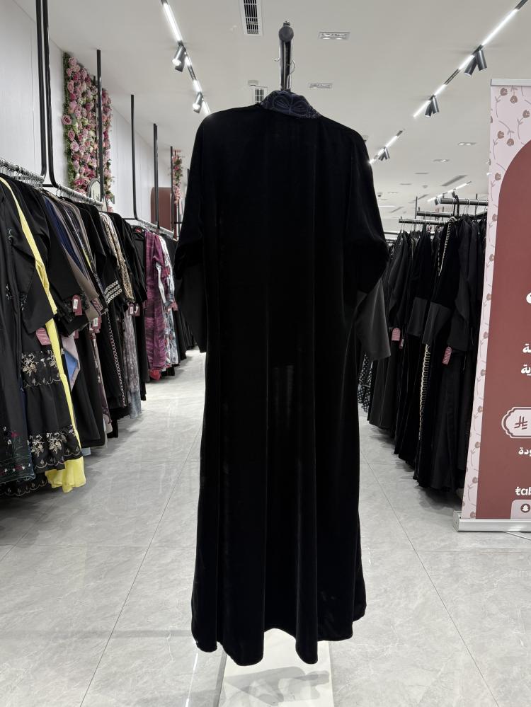 عباية مخمل فاخرة بقصة نصف كلوش، مزينة من الأمام بكلفة مطرزة تضيف لمسة أنيقة راقية.