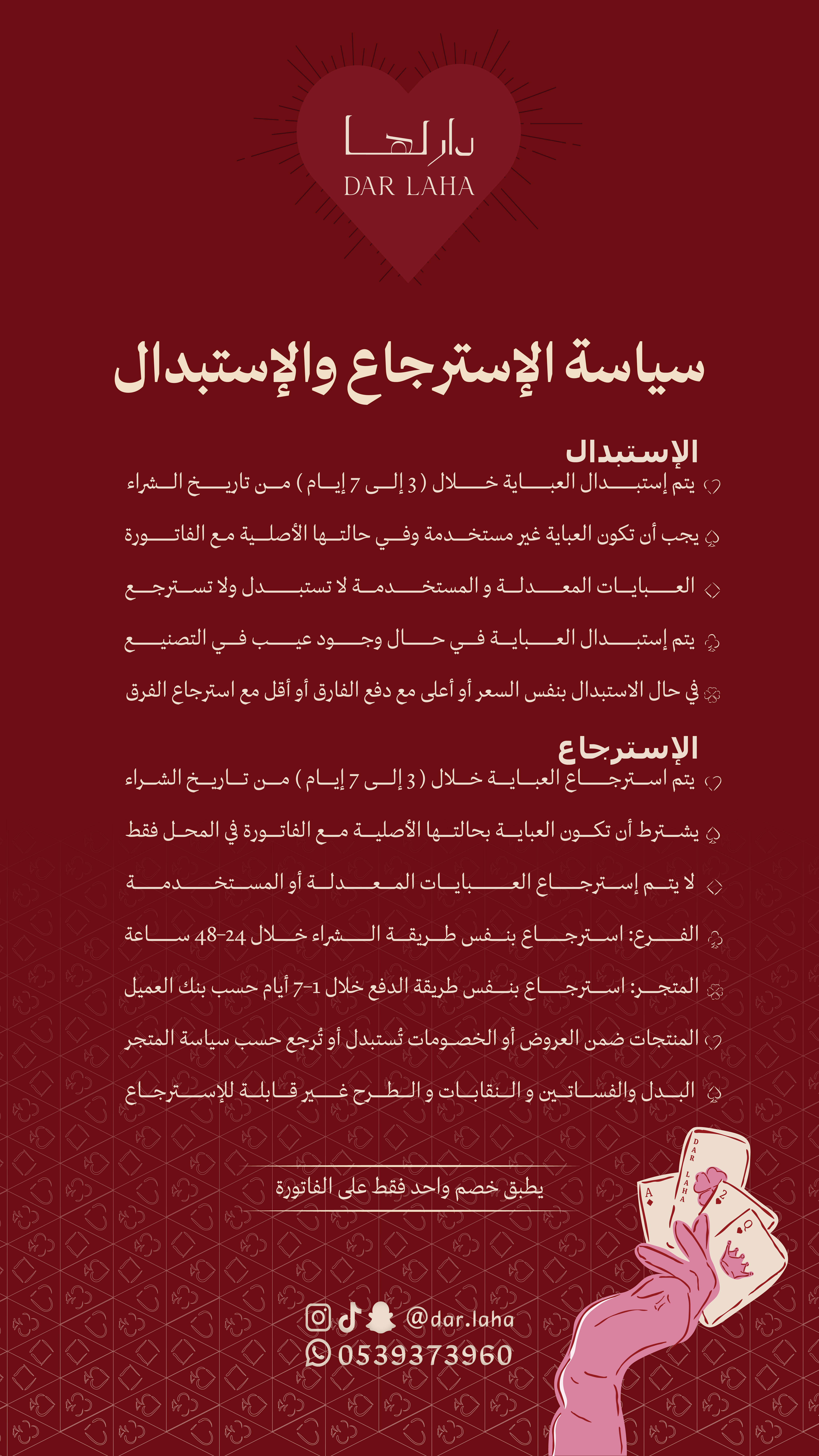 - يعد العميل موافق على الشروط المذكورة أعلاه بمجرد الطلب عبر الموقع ولوضوح سياسة الاسترجاع والاستبدال ، ولا تتحمل الشركة مسؤولية عدم اطلاع العميل على السياسة .